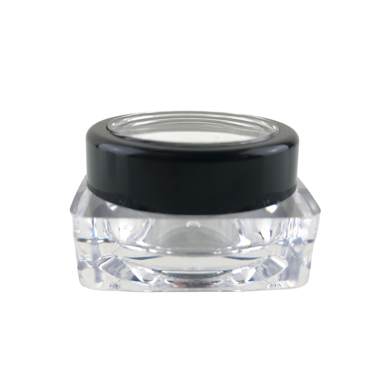 Luxury design quality beauty packaging jars with a clear square base and black trim clear acrylic window lids. This makeup container can store solid or powder products.