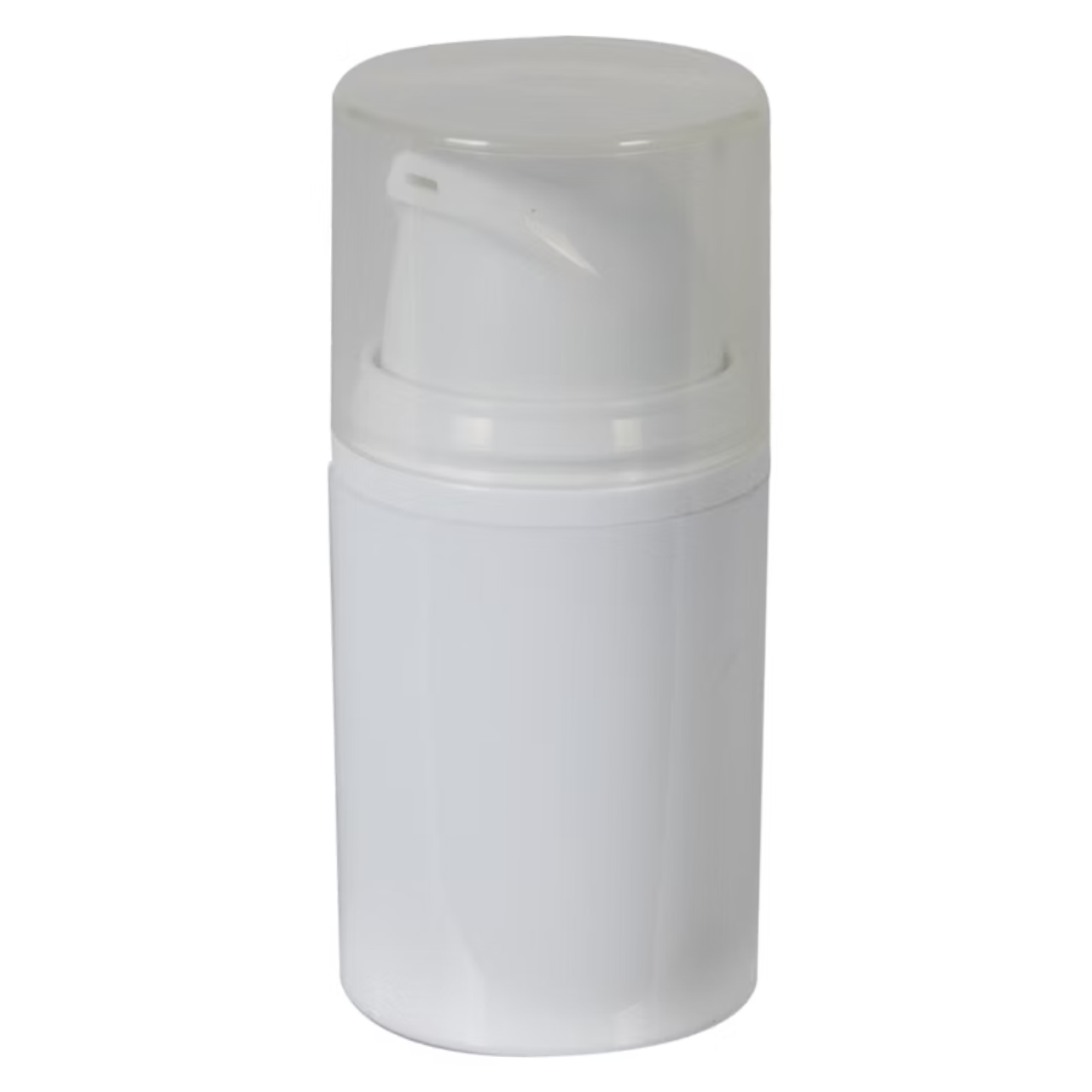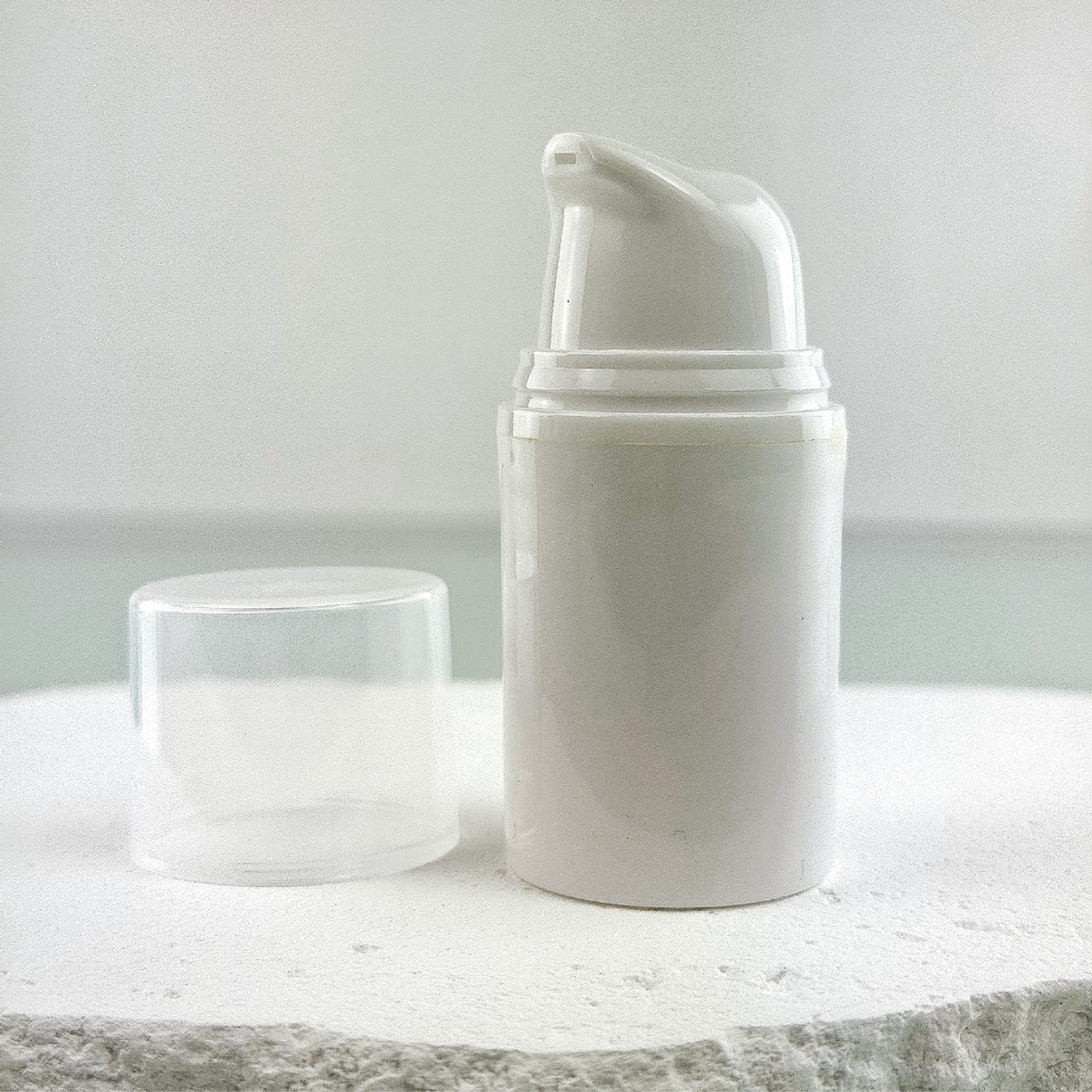 • 15 ML White Airless Pump Bottle with a clear over cap sitting next to the bottle