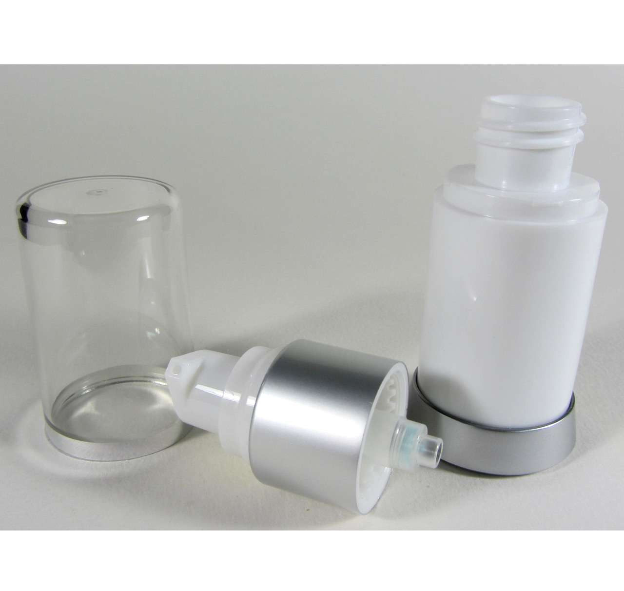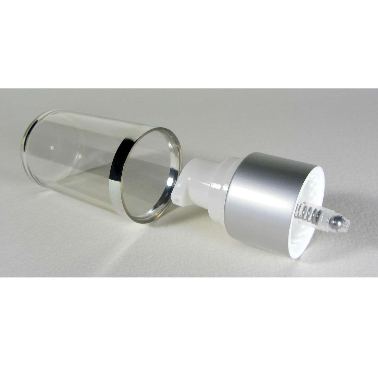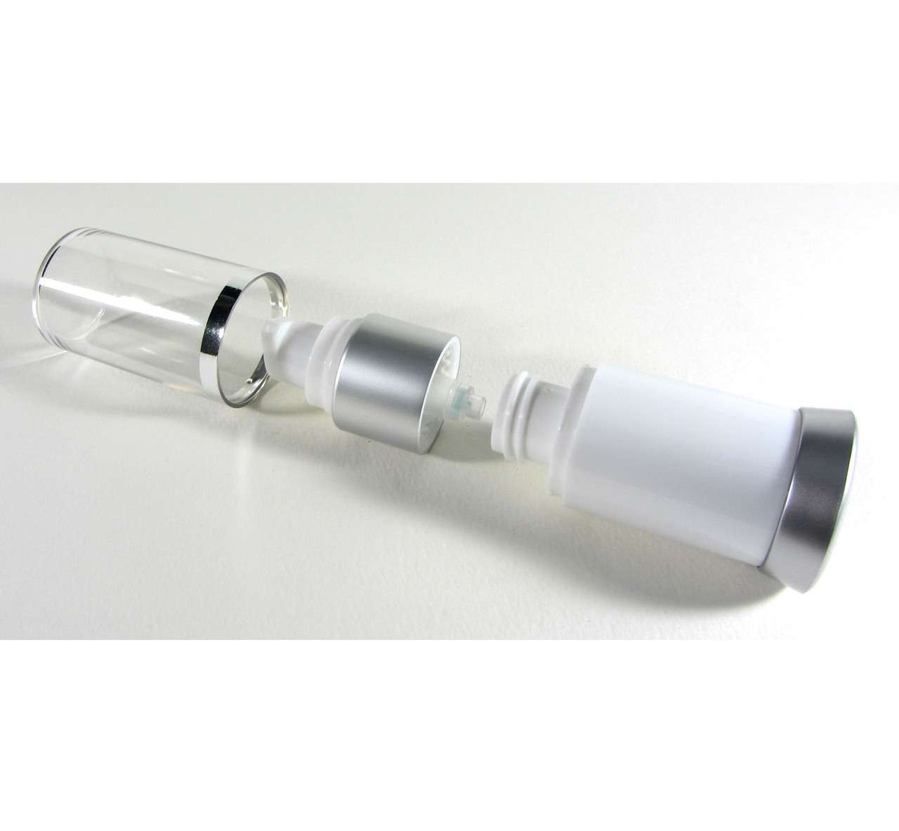 The Airless Pump Bottle is 4" tall with the cap on and a capacity of 15 ml or 0.5 fl. oz. The body of the bottle is white, the pump and the base are silver, and there is a clear cap with silver trim that goes on the top. This is a very professional-looking packaging for your product, and you can easily place clear gloss labels with your imprint or use hot stamping on the bottle to finish the packaging. This bottle will prevent the product from coming in contact with oxygen during use to preserve the active ingredient and maintain shelf life. The Airless Pump Bottle will help minimize waste as the product is being pushed to the pump via a disk.