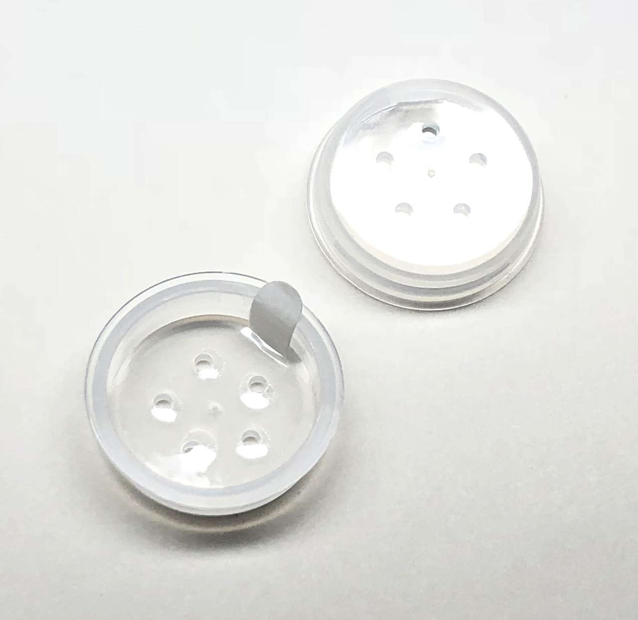 Clear plastic jar sifters designed to sit inside of the cosmetic jars to dispense powder product.