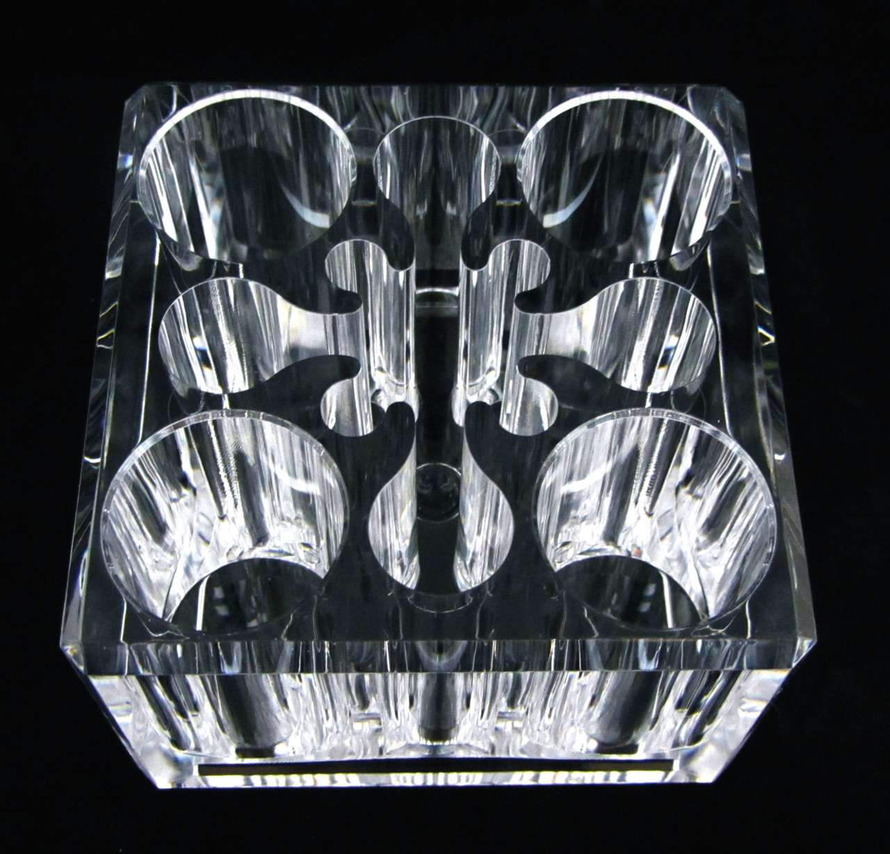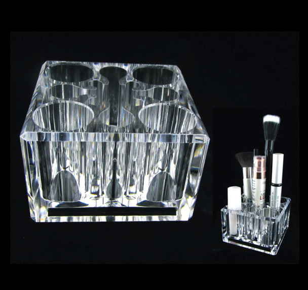 - This beautiful acrylic cosmetic holder will hold 13 cosmetic items or brushes. There are four large, 4 medium and four small slots plus one opening in the center. The large slot is approximately 1 1/8 inch diameter, medium slot is approximately 3/4 inch diameter and the small slot is approximately 1/4 inch diameter. All slots are approximately 1 3/4 inch tall. The base is approximately 3 inch x 3 inch square and the height is approximately 2 inch. They are perfect for items such as foundation stick, cheek color, lip gel, lip stick, lip/eye liner pencils and makeup brushes.
