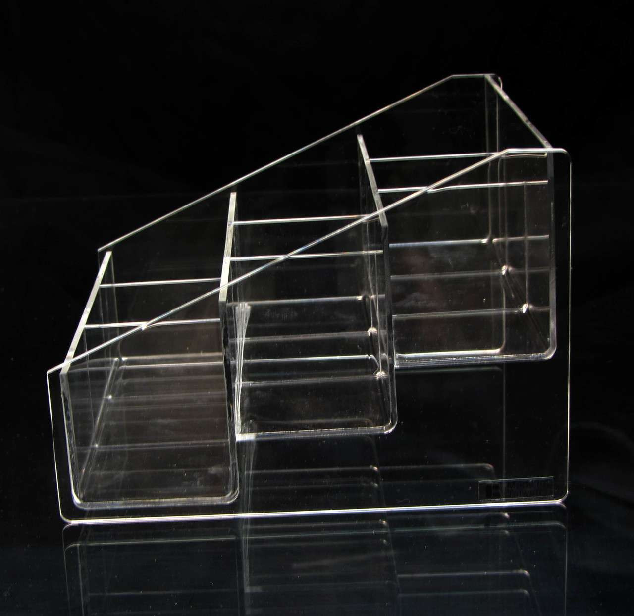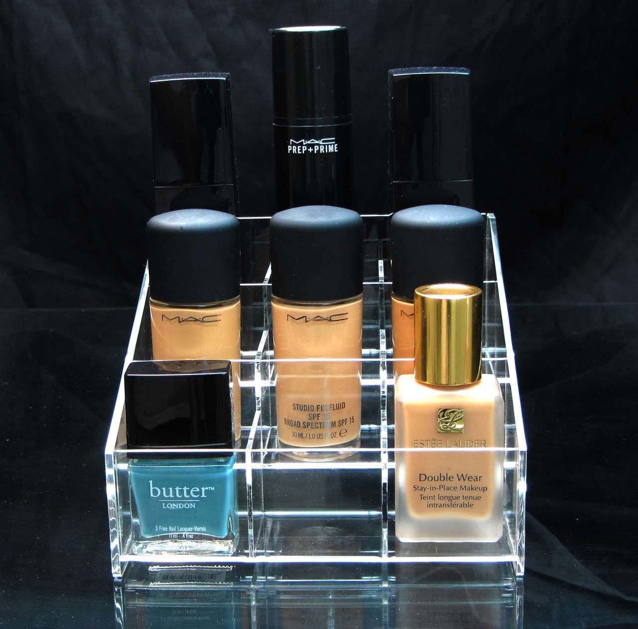 This beautiful 9 compartment acrylic organizer will hold nail polish and a wide variety of cosmetic products. The cascading design allows for easy viewing of the middle and back rows of products.