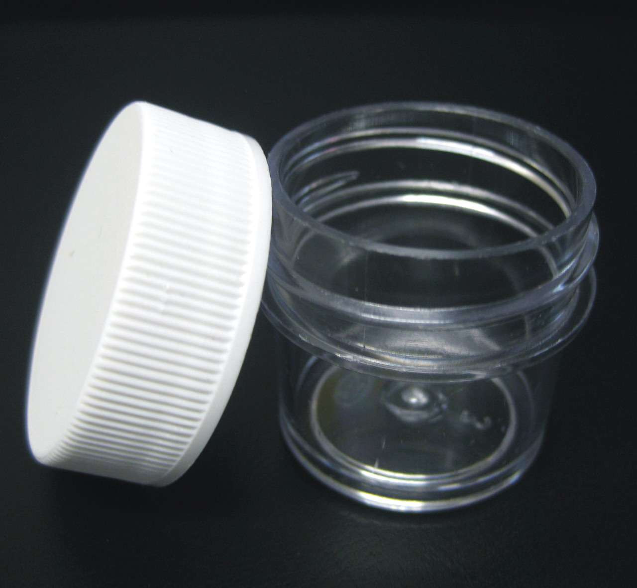 A clear plastic 7.5 ml jar container with a lined screw-on cap keeps air out and preserves the product inside. It is ideal for nail glitter, nail art, gel, cosmetics, and skincare products.