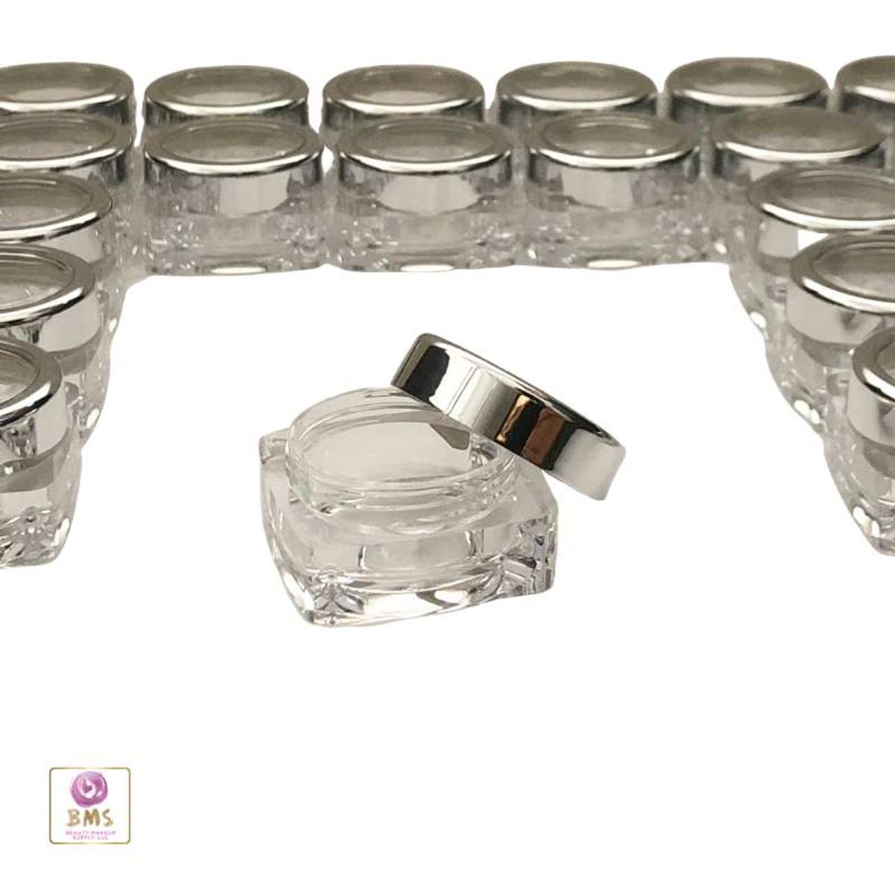 Elegant design of high-quality cosmetic packaging jars with clear square base and gold trim or silver trim clear acrylic window lids. These beauty containers can house solid or powder products. For packaging powder cosmetic products, select from three different jar sifters to fit inside the cosmetic jar.
