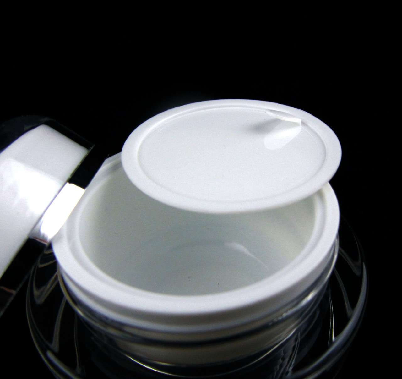 Stylish acrylic cream jar to private label your high-end products. Each set consists of one jar cap, one jar base, and one sealing disc. Sealing discs provide greater compatibility.