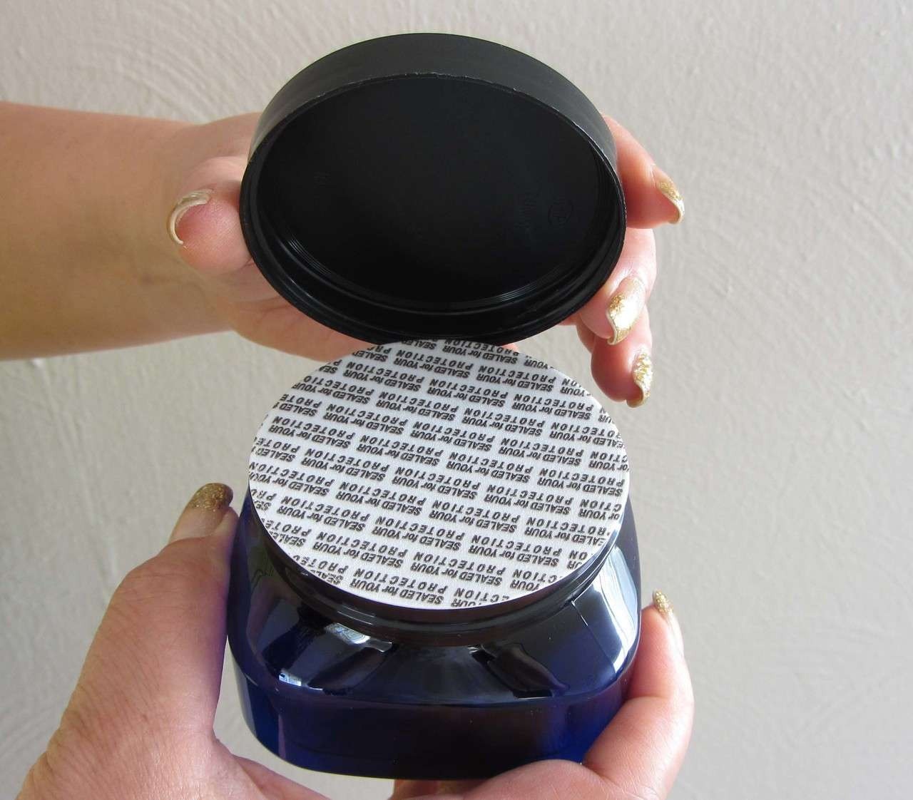 Bath & Body care cobalt square container paired with a black cap and a pressure sensitive liner with printing of "SEALED for YOUR PROTECTION " all over the seal. The pressure sensitive liner will adhere to the jar opening when the cap is screwed securely on to the jar. The purpose of the liner is to provide a tamper evident seal.