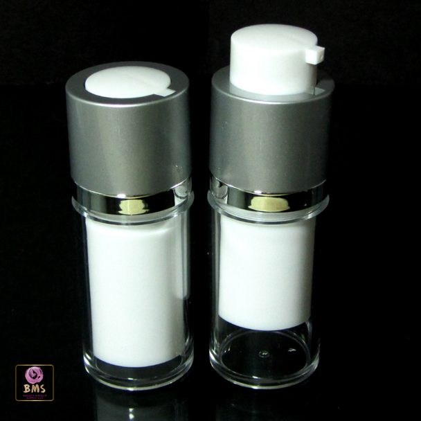 An airless pump lotion bottle will prevent the product from being exposed to oxygen during use to preserve the active ingredients and prolong shelf life. The airless pump bottle provides ease of use and minimizes waste as the product is being pushed up to the pump via a disc. Twist-up pump style creates consumer interest and increases product value. The formulation is housed in a white tube, and the outer body of the pump is a clear acrylic sleeve. Screen printing or labeling can be placed on the white area of the tube, and the clear outer sleeve will snap in place with a pressing tool to close the pump and bottle. To see an example of this product in use, click here. The same style bottle is also available in 30ML and 50 ML. See last photo.