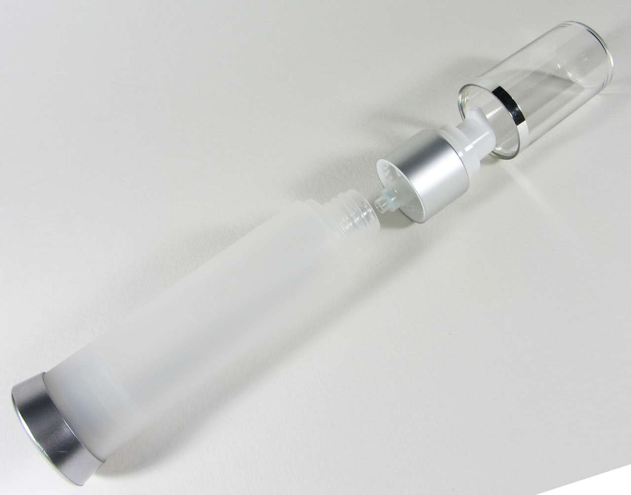 The Airless Pump Bottle is 6 inch tall with the cap on. The bottle's body is frost so the remaining product level is visible. The pump and the base of the bottle is silver and there is a clear cap with silver trim that goes on the top. This is a very professional looking packaging for your product and you can easily place clear gloss labels with your imprint or use hot stamping on the bottle to finish the packaging. This bottle will prevent product come in contact with oxygen during use to preserve the active ingredient and maintain shelf life. The Airless Pump Bottle will help to minimize waste as the product is being pushed up to the pump via a disk.