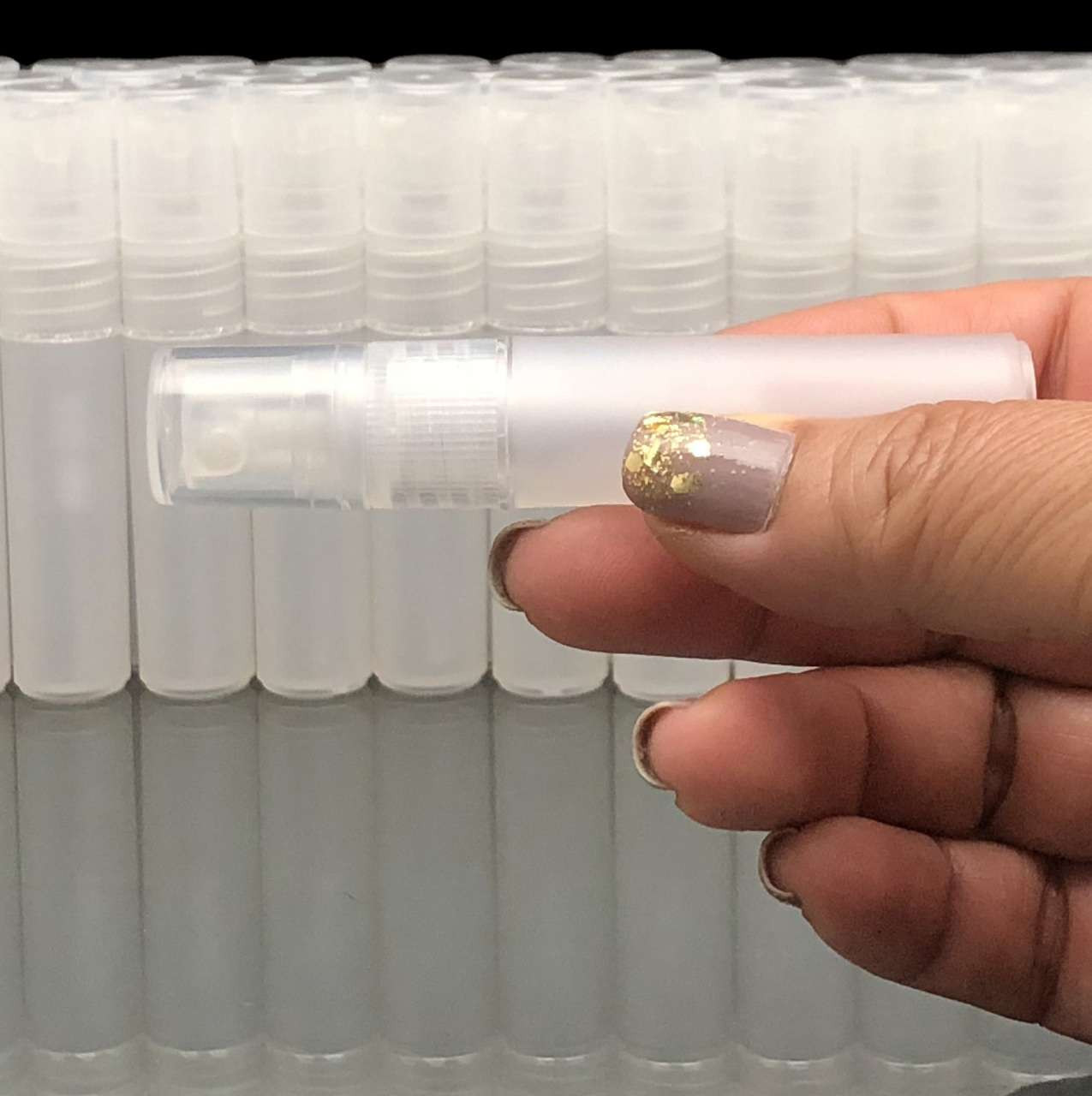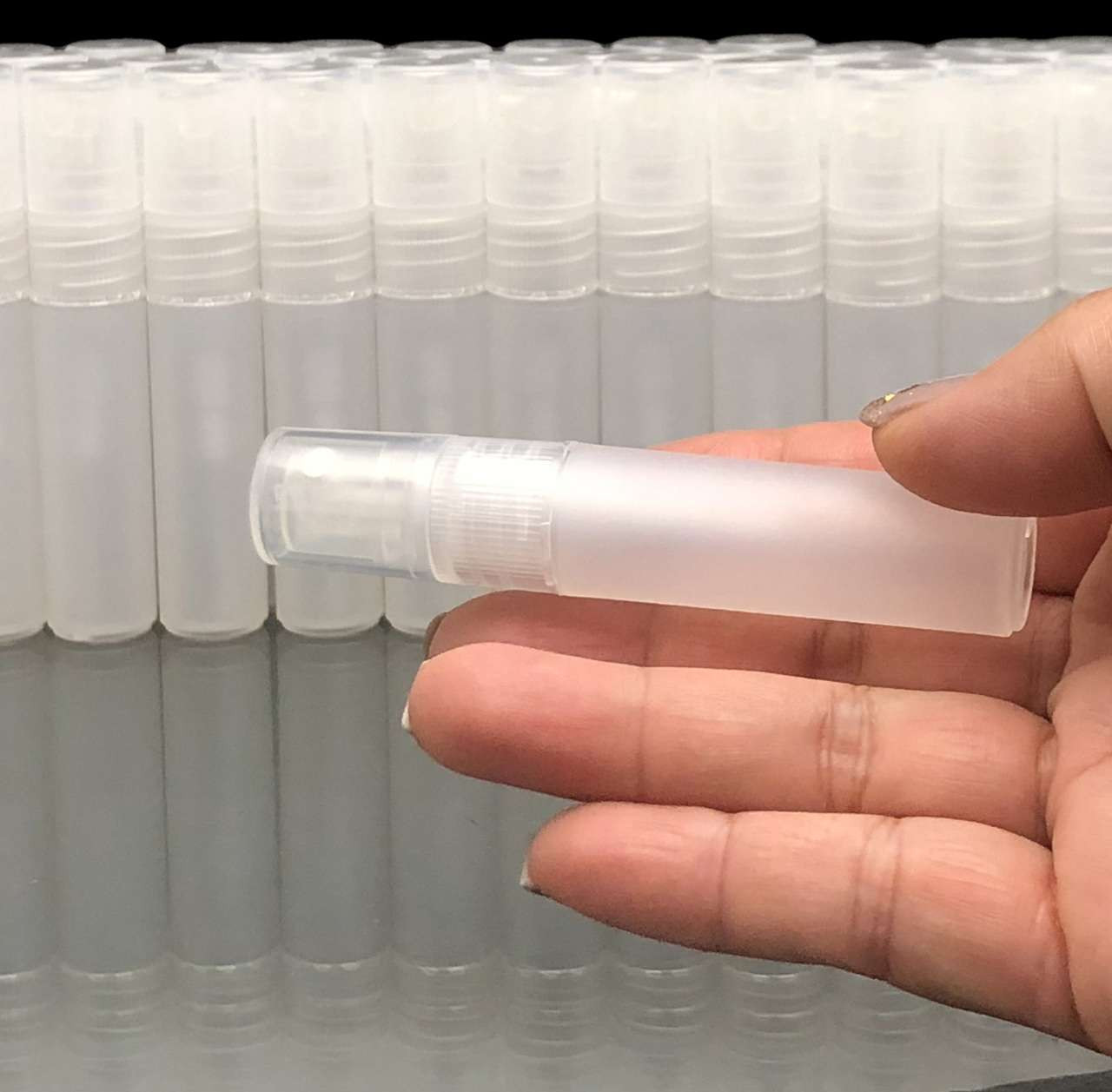 Frosted atomizer spray bottle ideal for carrying liquid products such as perfume, alcohol, eyeglass cleaning solution, and more. It's also a handy bottle for traveling.