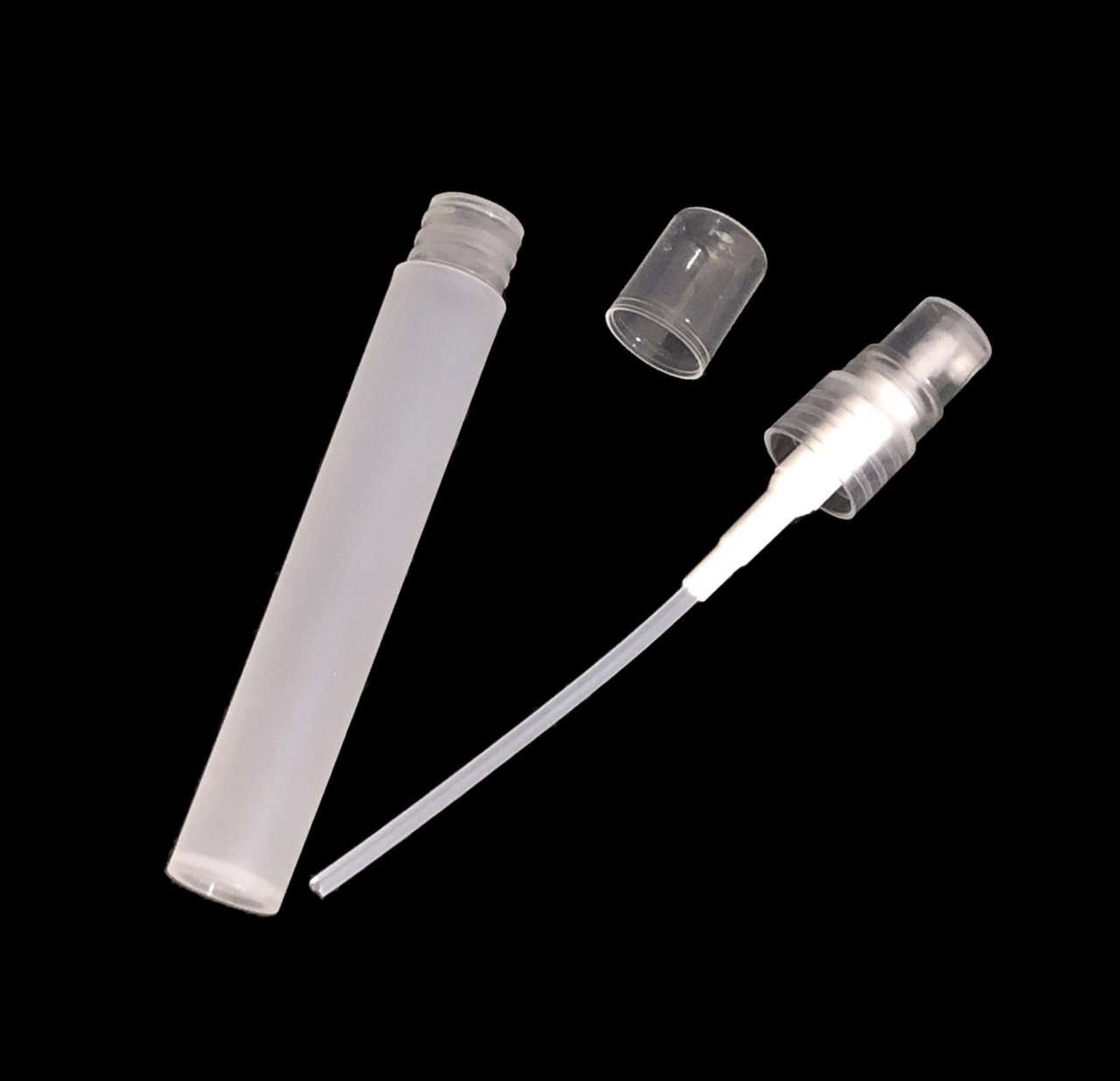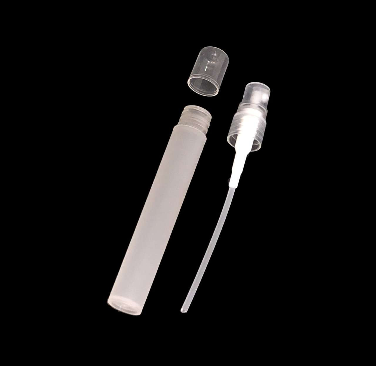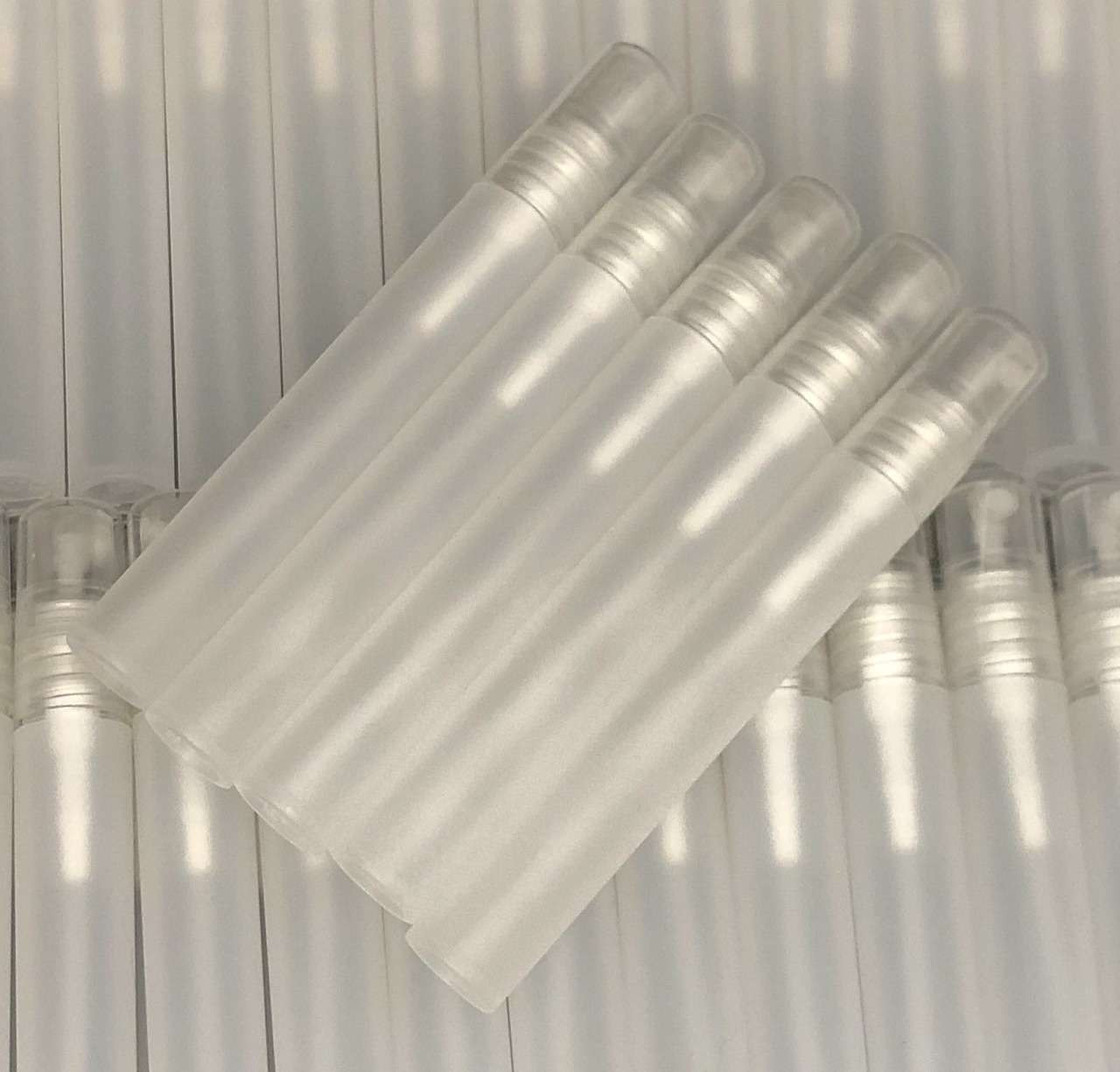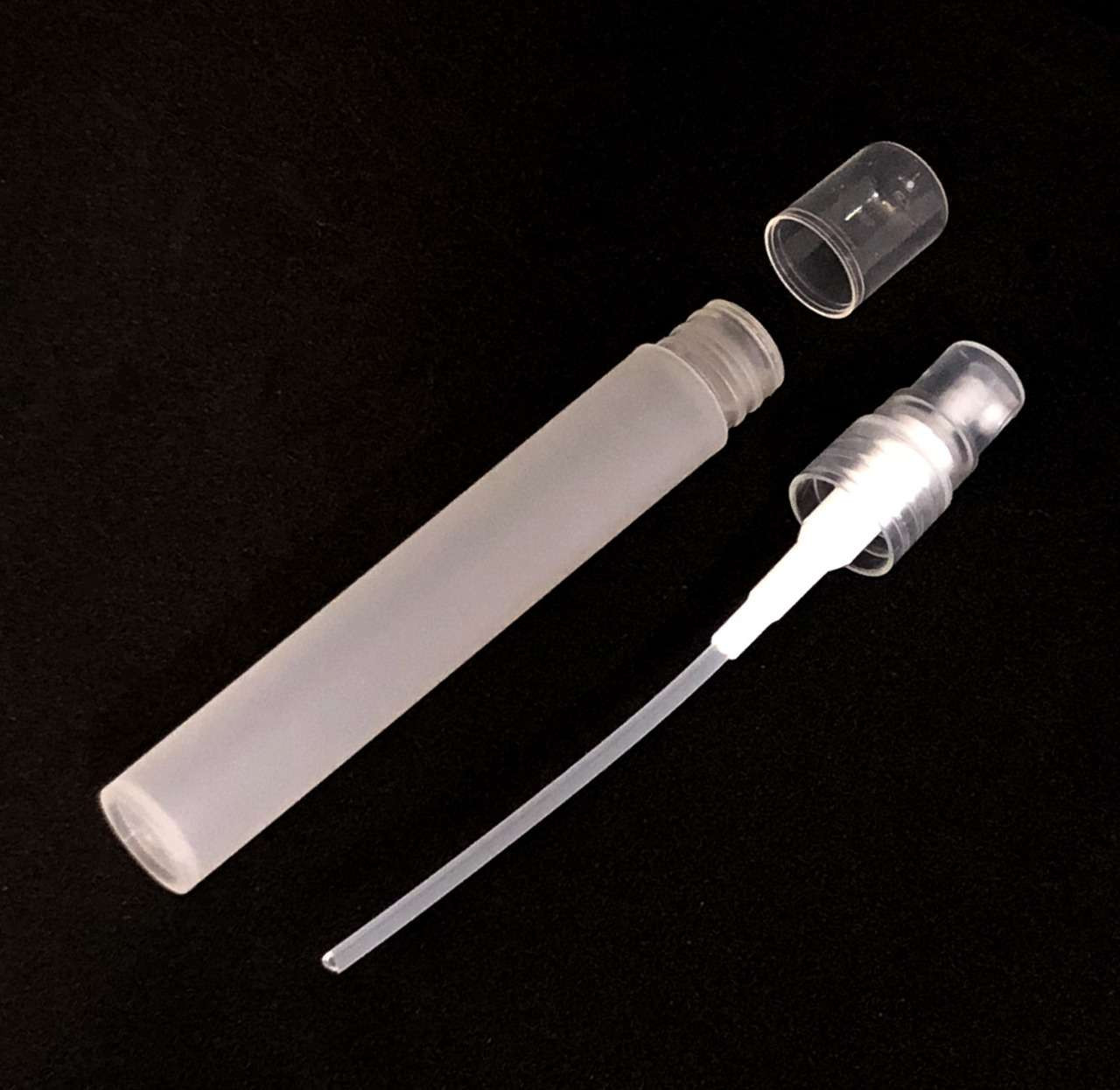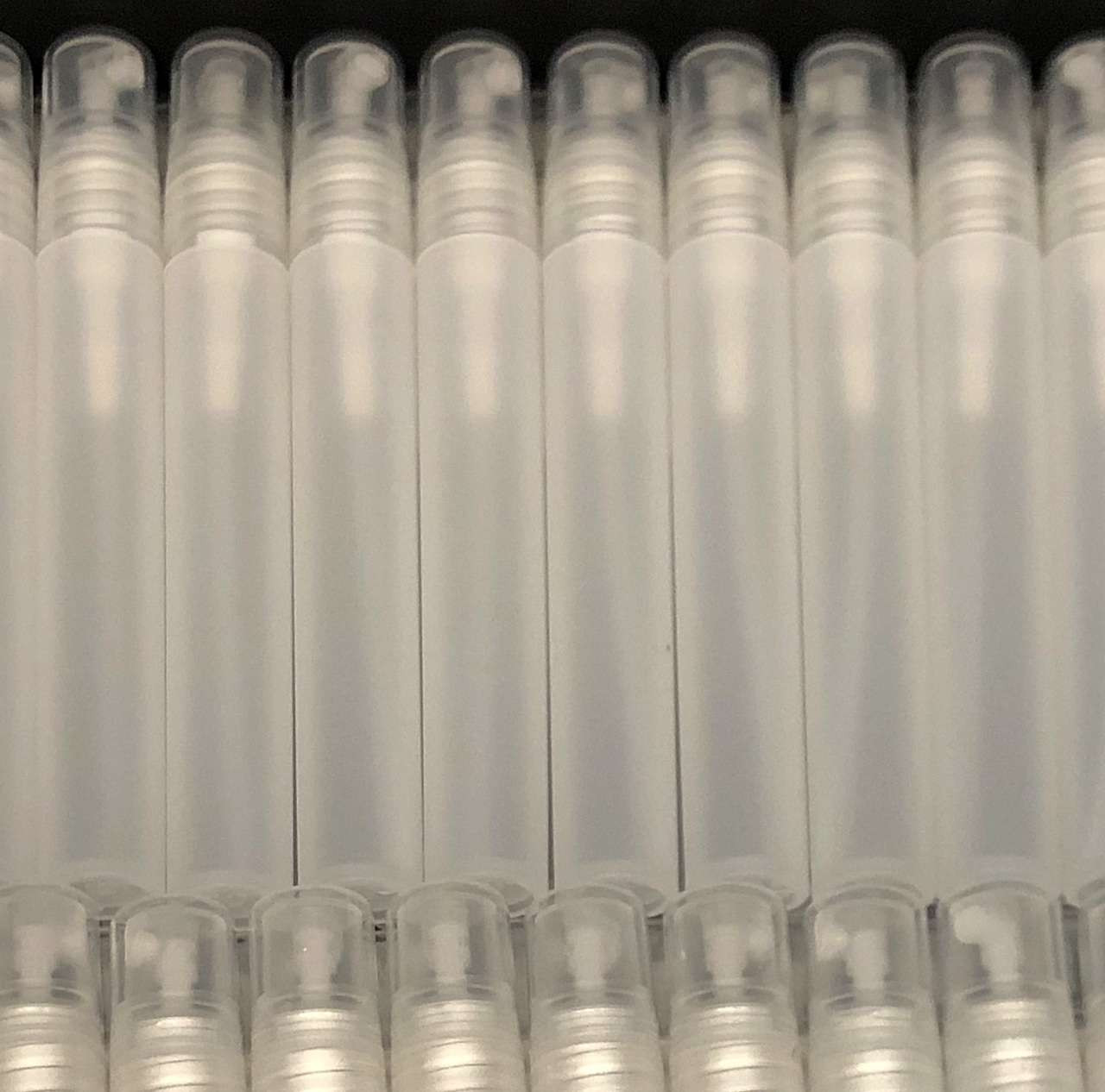 Frost plastic 10 ml fine mist spray bottles designed for liquid products such as perfume, alcohol, eyeglass cleaning solution, and more. Each set includes a tube bottle, a spray pump, and an over cap. Always perform proper fitness tests prior to production to ensure the compatibility of ingredients to packaging.