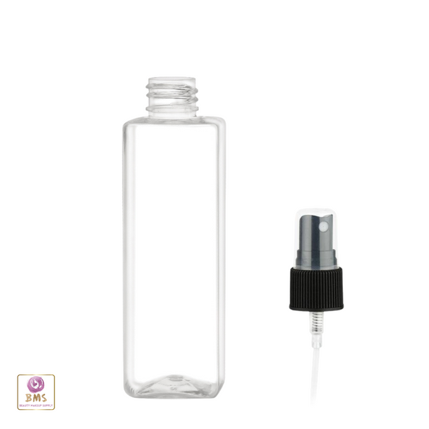 Plastic Bottles PET Square Liquid Bottles Black Fine Sprayer - 4 oz. (Clear) • 9784SB