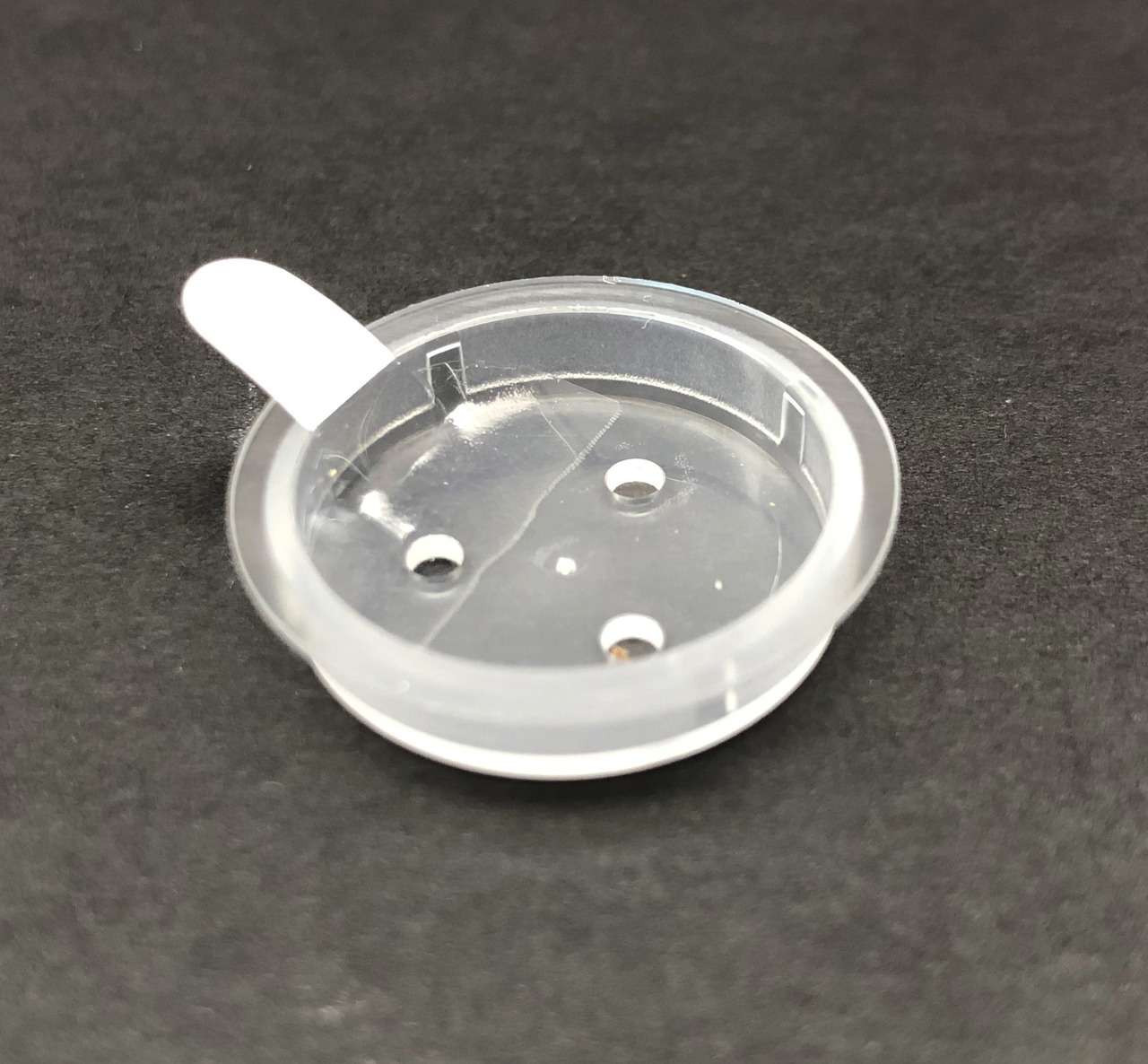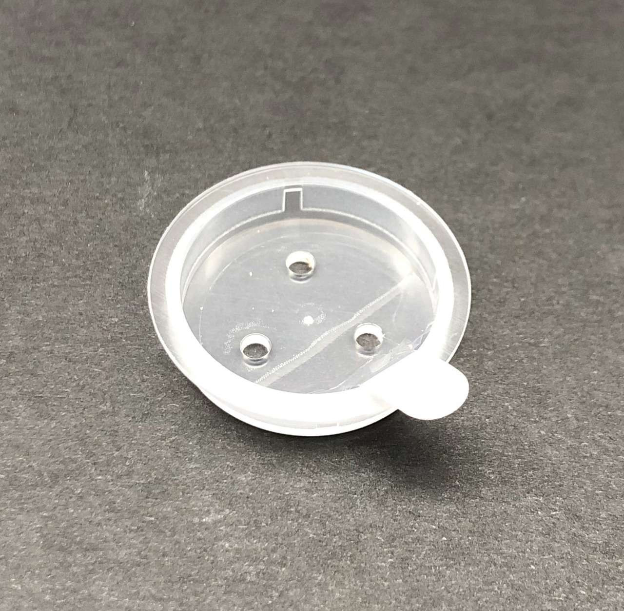 A plastic jar sifter sits inside the cosmetic jar when packaging powder products to allow the product to dispense evenly.