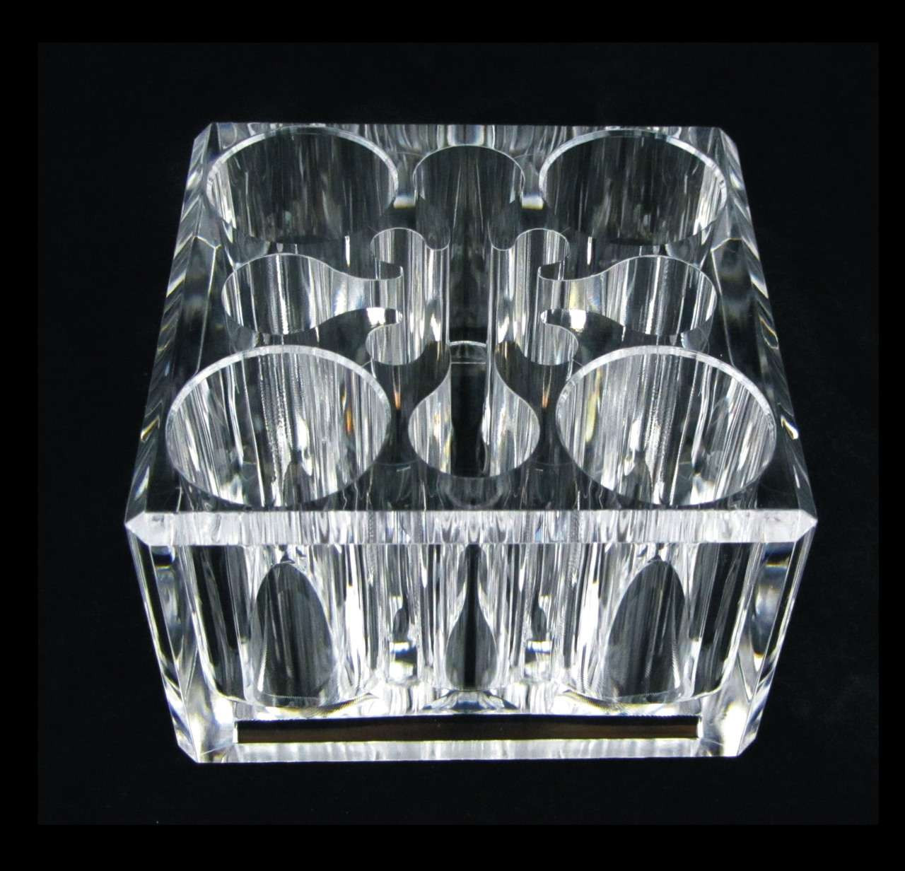- This beautiful acrylic cosmetic holder will hold 13 cosmetic items or brushes. There are four large, 4 medium and four small slots plus one opening in the center. The large slot is approximately 1 1/8 inch diameter, medium slot is approximately 3/4 inch diameter and the small slot is approximately 1/4 inch diameter. All slots are approximately 1 3/4 inch tall. The base is approximately 3 inch x 3 inch square and the height is approximately 2 inch. They are perfect for items such as foundation stick, cheek color, lip gel, lip stick, lip/eye liner pencils and makeup brushes.