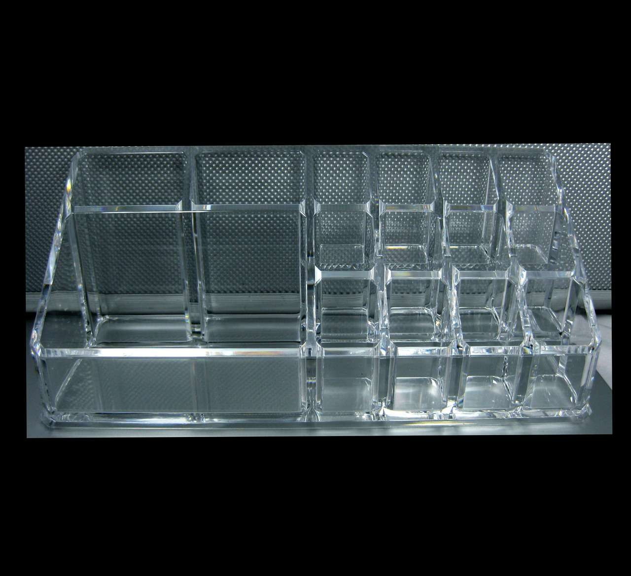 This beautiful acrylic cosmetic & makeup organizer is approximately 3.5" X 8.75" base and the height for the front of the organizer is approximately 1.25" and the rear is approximately 3.5". There are 2 open sections for storage on the left side of the organizer and the right side of the organizer has 12 spaces for tubular type of makeup such as lipsticks and each row is cascade so you can see the product that are placed in the rear of the organizer clearly. Sample products are not included.