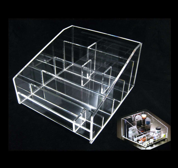- This acrylic organizer has a total of 9 compartments in different sizes. The size of the organizer is approximately 6.75" wide x 7.5" depth x 4" height at the rear of the organizer. Content in the organizer is not part of the sale.