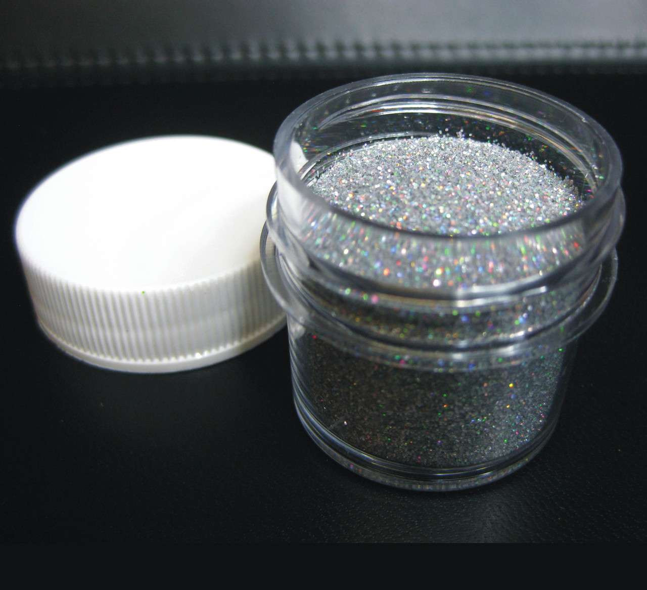 A clear plastic 7.5 ml jar container with a lined screw-on cap keeps air out and preserves the product inside. It is ideal for nail glitter, nail art, gel, cosmetics, and skincare products.